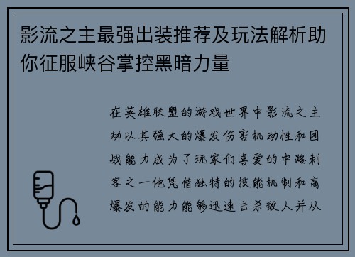 影流之主最强出装推荐及玩法解析助你征服峡谷掌控黑暗力量
