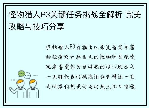 怪物猎人P3关键任务挑战全解析 完美攻略与技巧分享